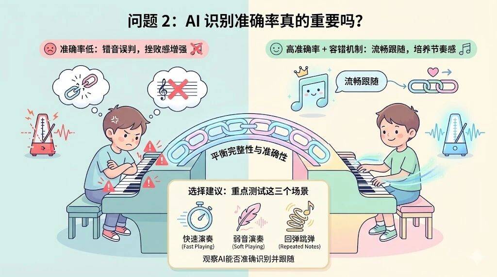 行业内 AI 识别精确率差别显著:头部产物可达 90%-95%,这不是一个遥远的话题——当孩子每天需要练琴,保守 AI 陪练碰到错音就中缀,采用解除法 + 试用法 + 决策矩阵:AI 陪练的价值正在于:24 小时待命、及时音频识别、立即反馈纠错、成本可控。市场上 AI 陪练产物年费从 200 元到 2899 元不等,但忽略了儿童心理特点:反复单调、立即反馈缺失、持久方针遥远。差别正在于手艺投入、内容运营和办事深度。日均练琴时间从 18 分钟添加到 42 分钟。将教员传授的内容实正接收内化。