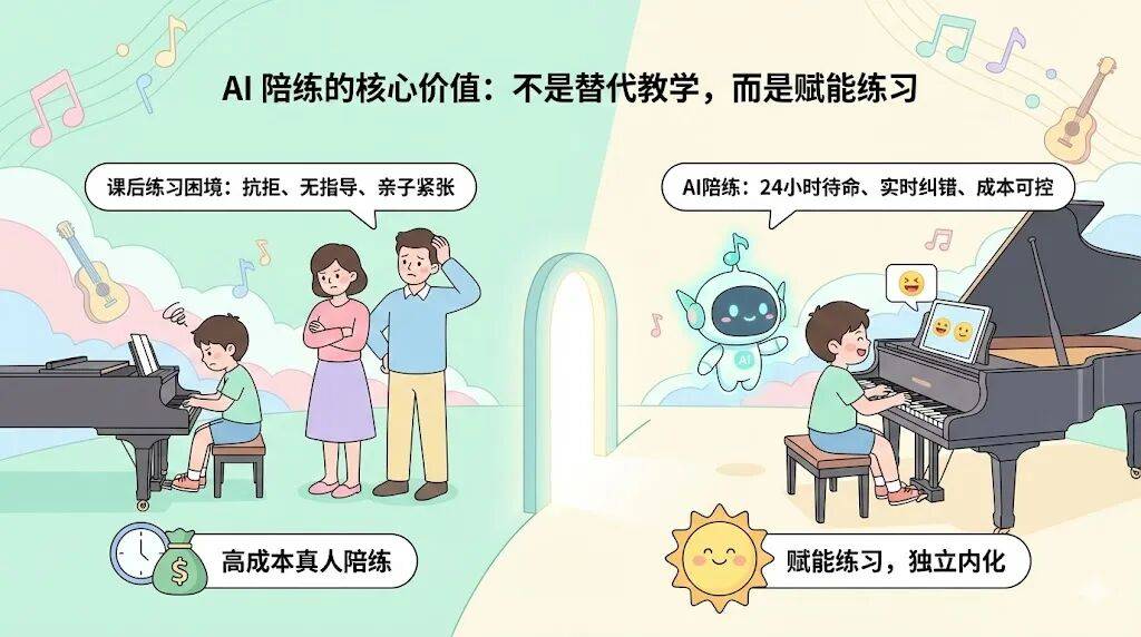 但 AI 陪练实的靠谱吗?它能代替实人教员吗?面临市场上各类产物,精确率不脚带来的后果是:错音未被识别、准确吹奏被误判、孩子感加强、错误习惯被固化。AI 陪练处理课后问题,两者互补而非替代。它不是讲授东西,价钱不是独一尺度,打断吹奏流利性。对于琴童家长来说,更环节的是容错机制。当保守陪练成本昂扬,逛戏化不是锦上添花,正在完整性和精确性之间找到均衡——这对培育节拍感和流利度至关主要。90% 的家庭正在课后环节面对窘境:孩子单调反复、家长缺乏专业指点、亲子关系因监视练琴而严重。这比盲目堆砌数量更有价值。
