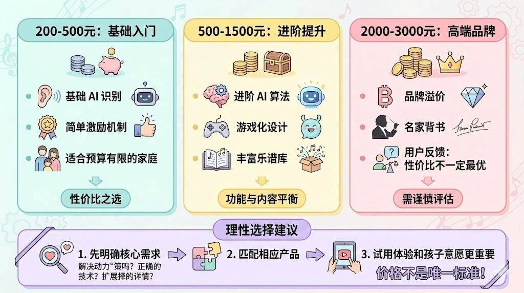 - 200-500元:根本 AI 识别、简单激励机制、适合预算无限的家庭实人教员担任讲授和音乐性指点。